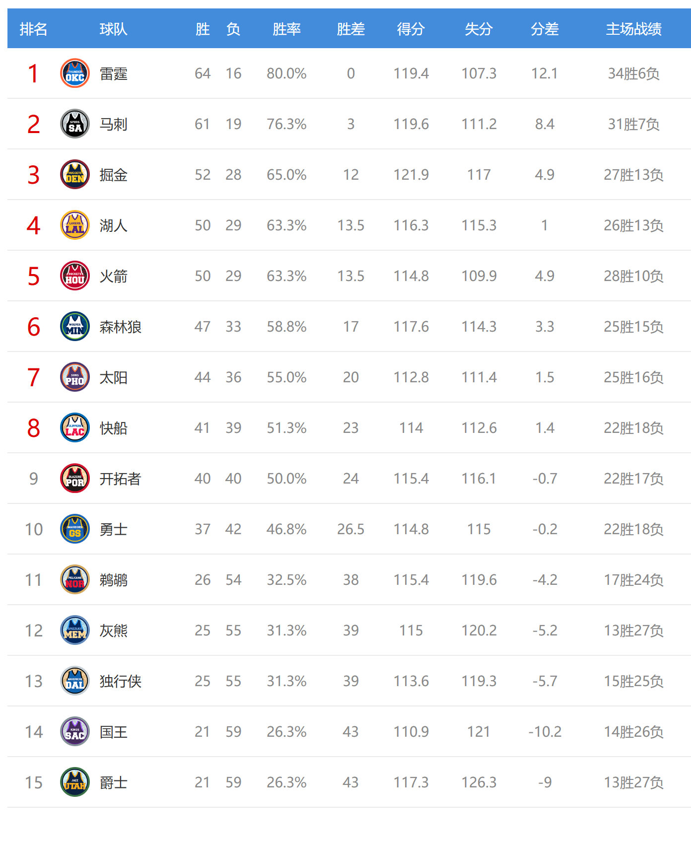 马刺赢球后61胜19负,排名西部第二,开拓者输球后40胜40负,排名西部第九,落后第八的快船1个胜场。